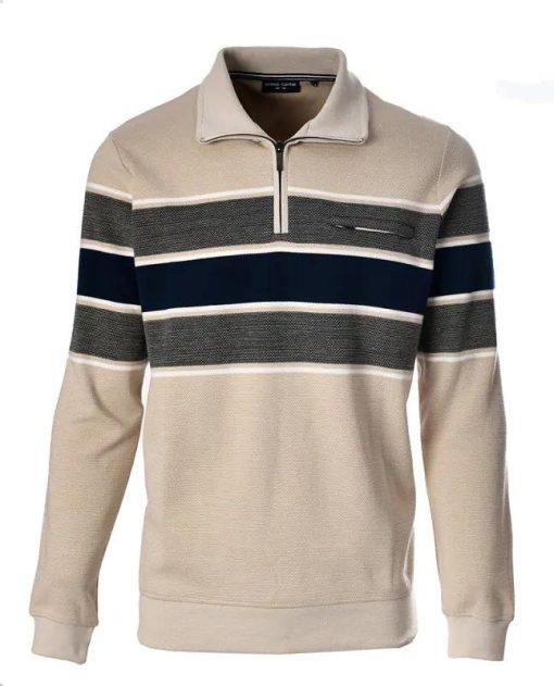Beige heren sweater van Chris Cayne met marineblauwe en grijze strepen, een ritskraag en handig borstzakje.