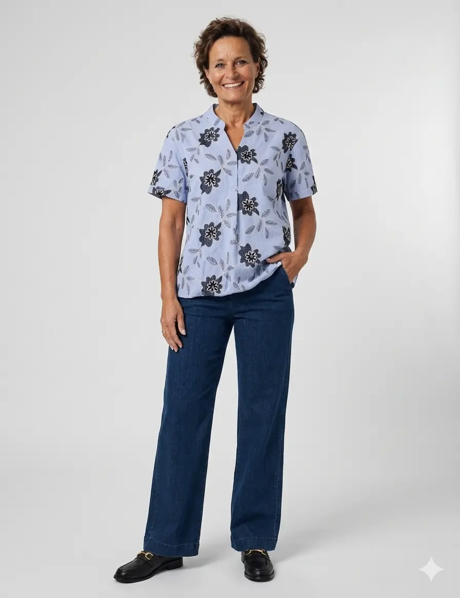 Enjoy Blouson Korte Mouw - Blauw/Wit Gestreept met Bloemenprint