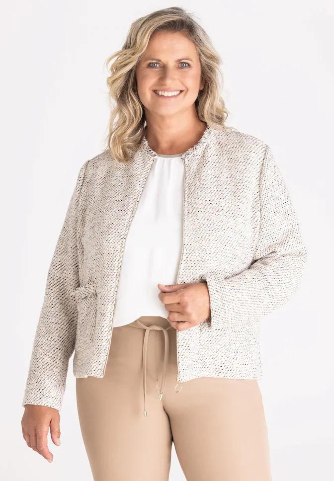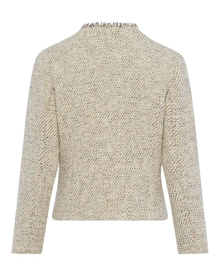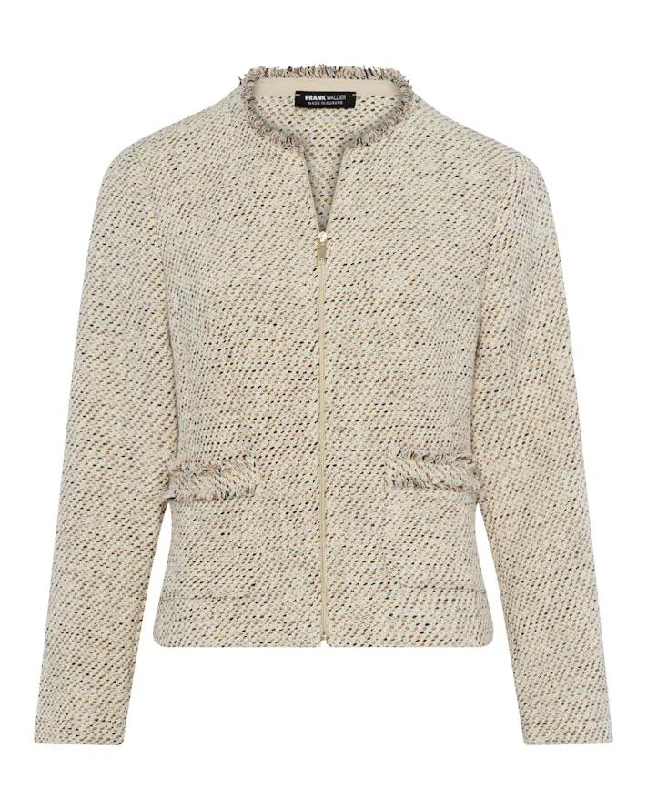 Frank Walder dames blazer gemeleerd beige marineblauw met rafeldetails en rijke structuur