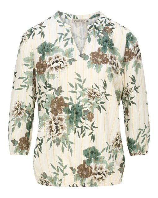 Stralend voor de dag komen doe je met de Dreamstar blouse Raquel. Deze prachtige top in de kleur ‘Jade Mix’ combineert een romantische bloemenprint met een subtiele glinstering dankzij de ingewerkte metaaldraad. De zachte ecru basis met groene en bruine tinten geeft je outfit direct een frisse en luxe uitstraling.