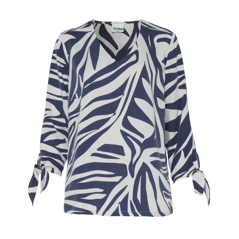 Blauw-wit geprinte dames blouse van Toni met V-hals en strikdetails aan de mouwen van 100% Lyocell