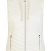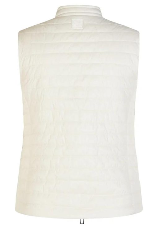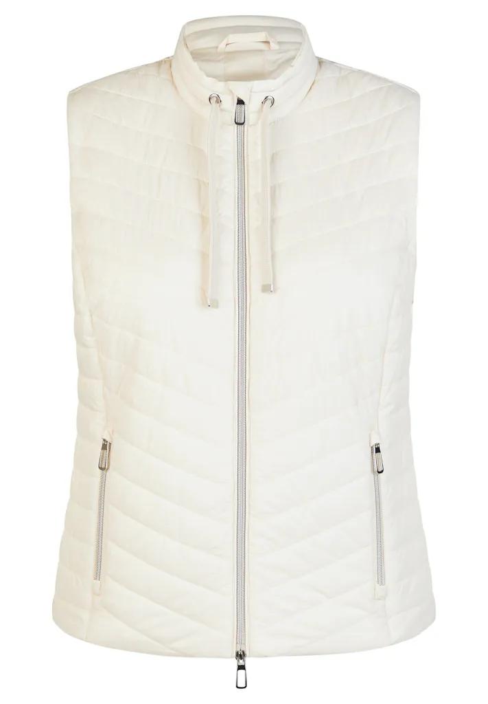 Geef je outfit een stijlvolle extra laag met deze prachtige licht beige bodywarmer van Rabe. Dit gewatteerde vest is de ideale metgezel voor frisse dagen; het biedt precies de juiste hoeveelheid warmte zonder je bewegingsvrijheid te beperken. Dankzij het verfijnde, horizontaal doorgestikte patroon krijgt de bodywarmer een slanke en moderne uitstraling.
