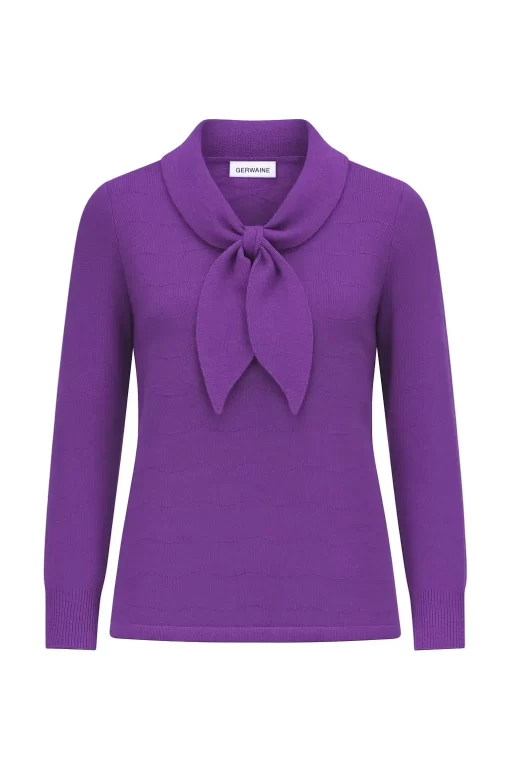 Deze paarse Germaine trui straalt elegantie en verfijning uit dankzij het charmante strikdetail bij de hals. De strik vormt een subtiel vrouwelijk accent en maakt deze trui bijzonder geschikt voor dames die houden van klassieke, verzorgde kleding met een zachte uitstraling.