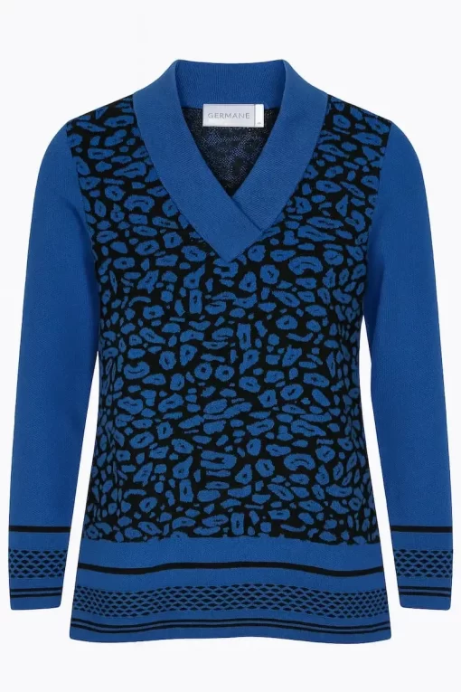 Deze stijlvolle damestrui van Germaine in een krachtige kobaltblauwe kleur met zwart dierenprintmotief is een echte blikvanger. De klassieke V-hals met brede kraag zorgt voor een elegante uitstraling, terwijl de verfijnde boorden met ingeweven motief een moderne touch toevoegen.
