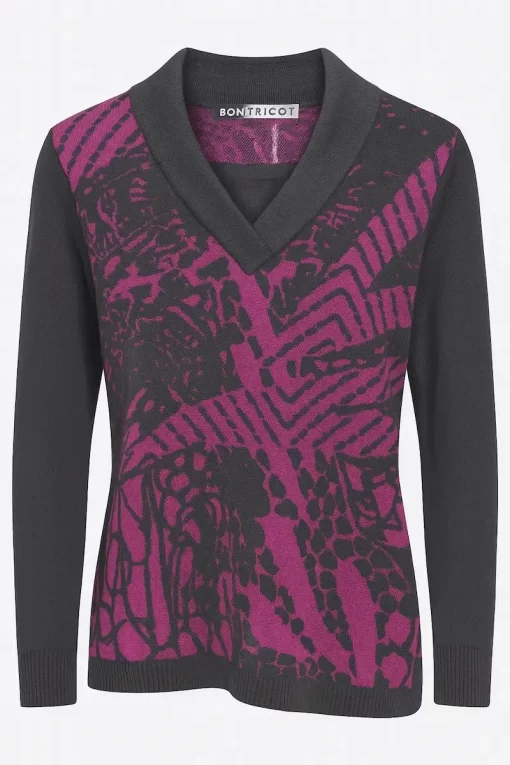 Deze trui van het merk Bon Tricot (onderdeel van het gerenommeerde merk Sensia) is ontworpen voor dames die houden van kleur en karakter in hun kleding. De trui combineert een diepe paarse basis met een opvallend abstract dessin in zwart, wat zorgt voor een levendige maar toch stijlvolle uitstraling.