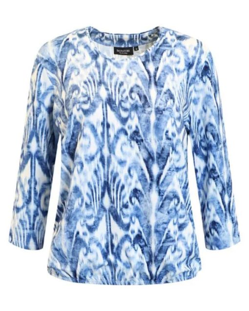 Breng kleur in je garderobe met dit prachtige Signature shirt in een frisse blauw-witte print. Dit truitje combineert een artistiek abstract dessin met een uiterst comfortabele pasvorm, perfect voor zowel een verzorgde dagelijkse look als een feestelijke gelegenheid.