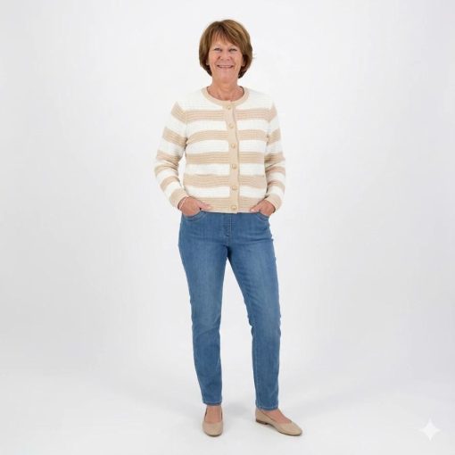 Geef je garderobe een tijdloze en luxe uitstraling met dit prachtige gestreepte vest van Micha. De combinatie van zandkleurige en witte banen zorgt voor een frisse, klassieke look die moeiteloos combineert met je favoriete jeans of een nette pantalon.