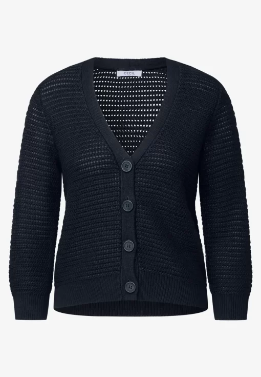 Tijdloos, luchtig en stijlvol – dit marineblauwe vest van Cecil is een must-have voor elke garderobe. Het kortere model met V-hals en knoopsluiting straalt eenvoud en klasse uit, terwijl de grofgebreide structuur zorgt voor een speelse en moderne twist. De frisse opengewerkte look maakt het vest ideaal voor de warmere dagen of als stijlvolle laag over een top of blouse.