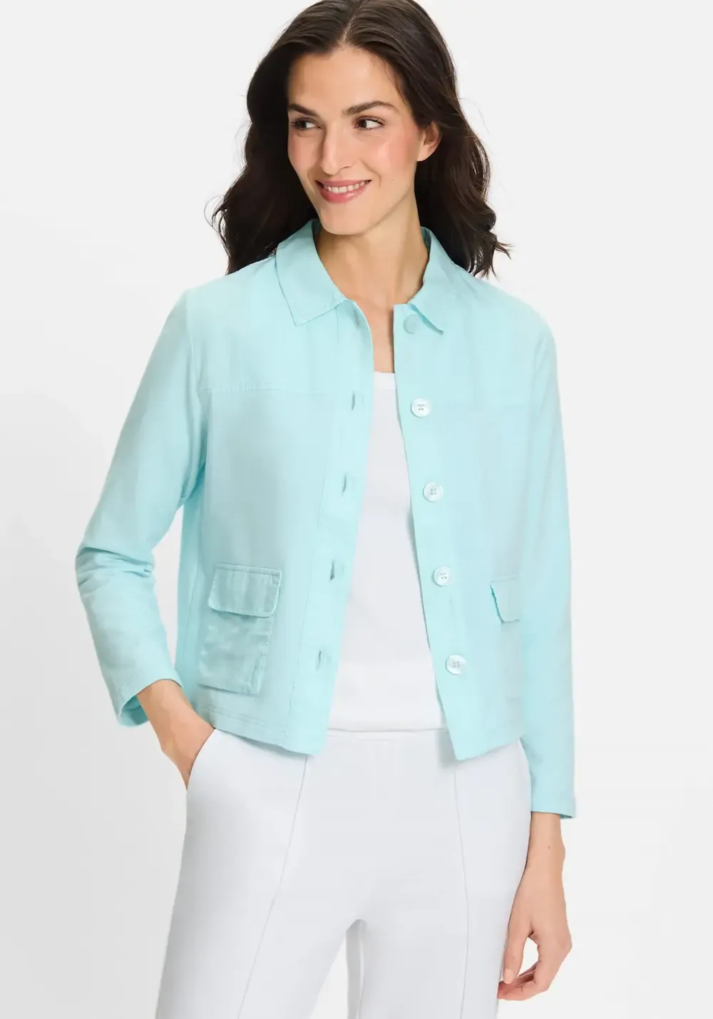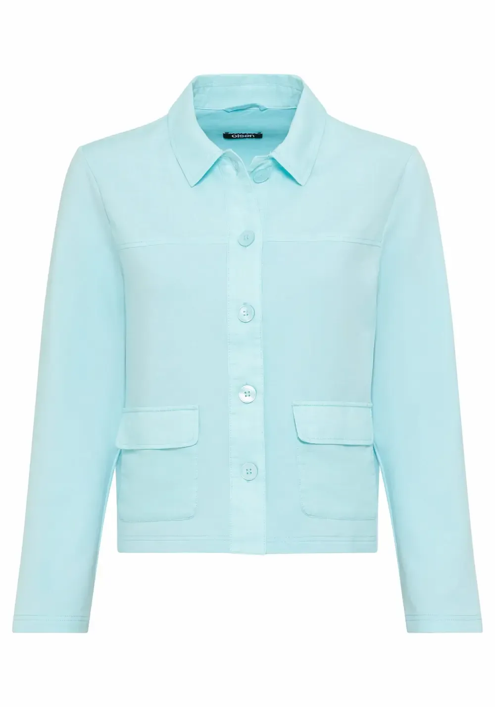Dit Olsen turquoise blousevest is een perfecte combinatie van comfort en stijl voor de zomer. Gemaakt van een soepele katoenmix (95% katoen, 5% elastan) en verrijkt met subtiele linnen elementen bij de opgestikte zakken, is dit jasje luchtig, vrouwelijk en veelzijdig.
