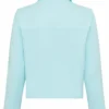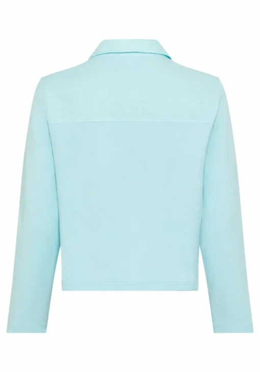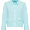Het korte model met klassieke kraag en knoopsluiting geeft het vest een elegante uitstraling, terwijl de kleur turquoise zorgt voor een frisse, zomerse vibe. De rechte snit en het licht elastische materiaal zorgen voor een prettige pasvorm die meebeweegt met je lichaam.
