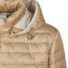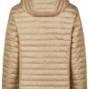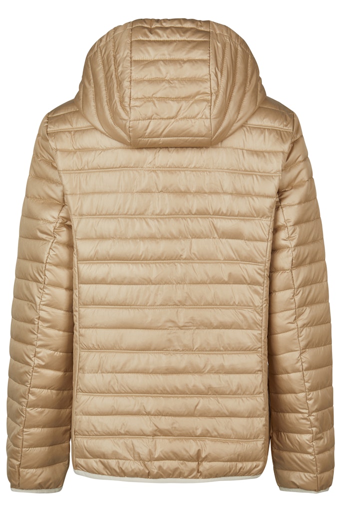 - Luxe Uitstraling: De glanzende champagne kleur in combinatie met de beige bies geeft de jas een chique, moderne look.