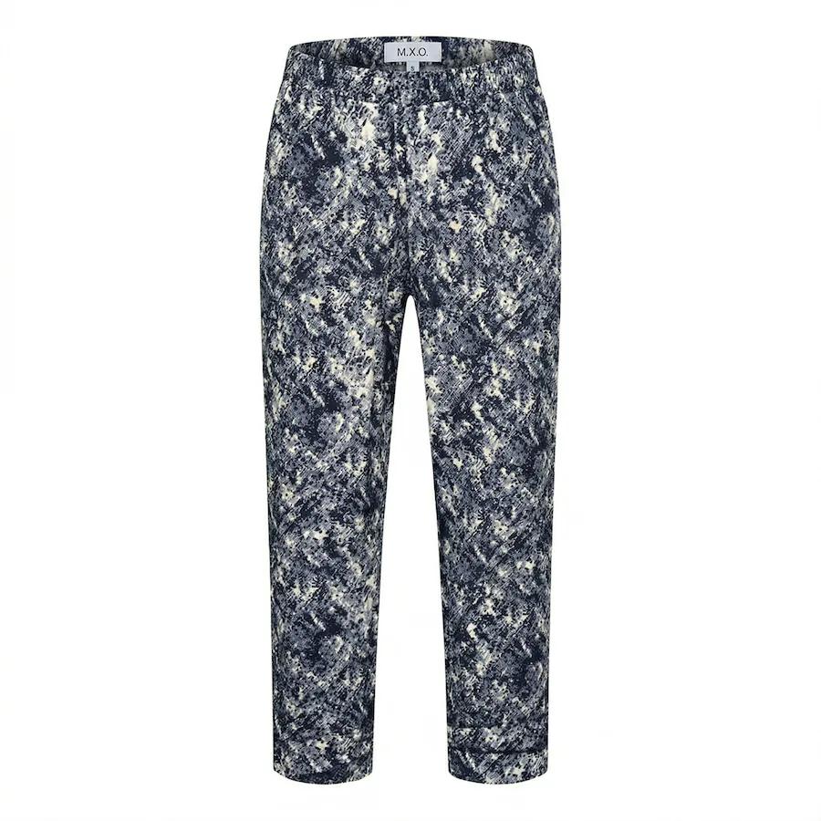 Geniet van ultieme vrijheid en een heerlijk koel gevoel met deze M.X.O relax broek in tijdloos donkerblauw. Deze broek is uw beste vriend tijdens warme dagen; de 100% viscose kwaliteit voelt zijdezacht aan en werkt verkoelend op de huid. Het abstracte motief in blauw- en witnuances geeft de broek een moderne en frisse uitstraling.