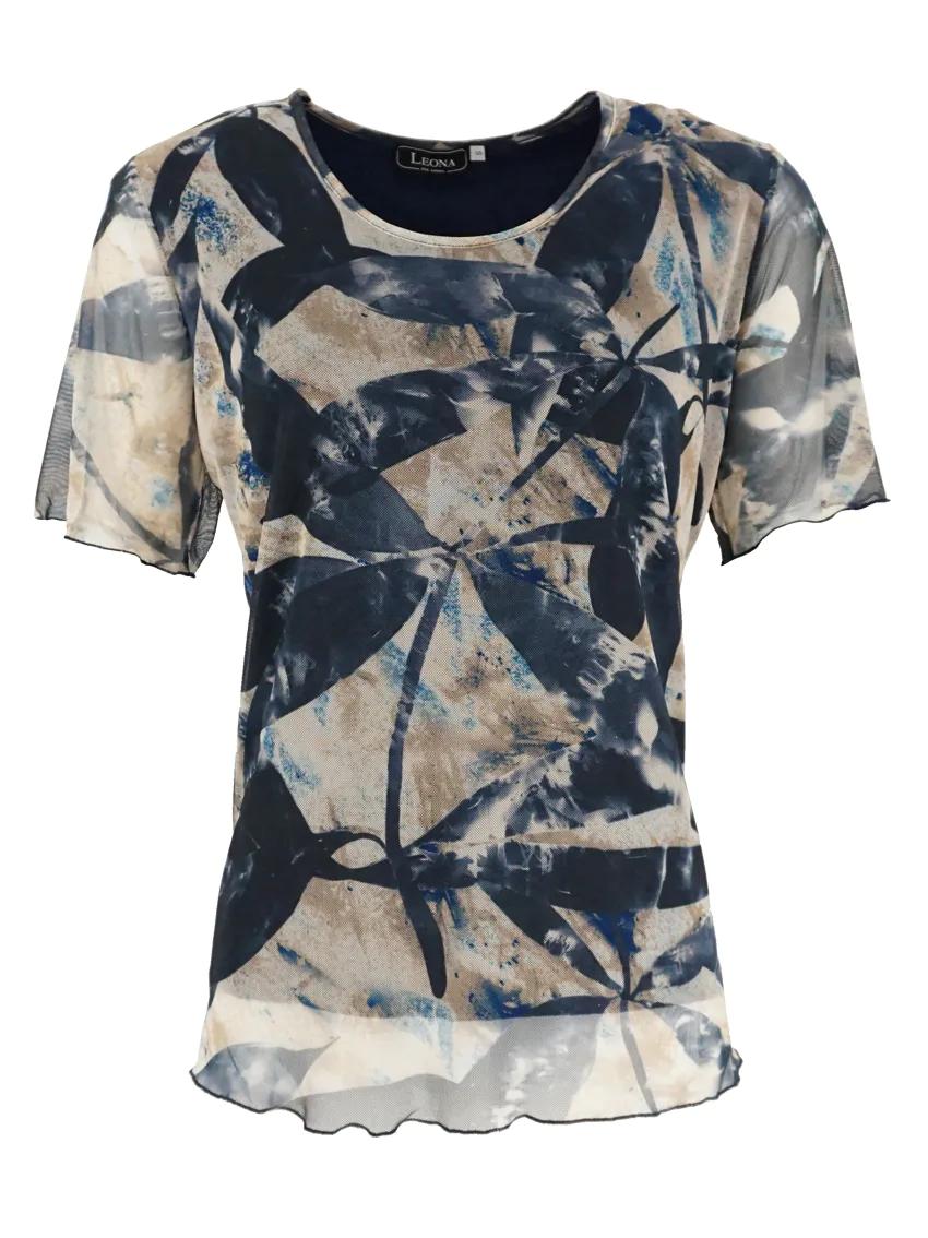 Leona per Donna Shirt – Dubbellaags Mesh – Marineblauw Beige – Abstracte Print