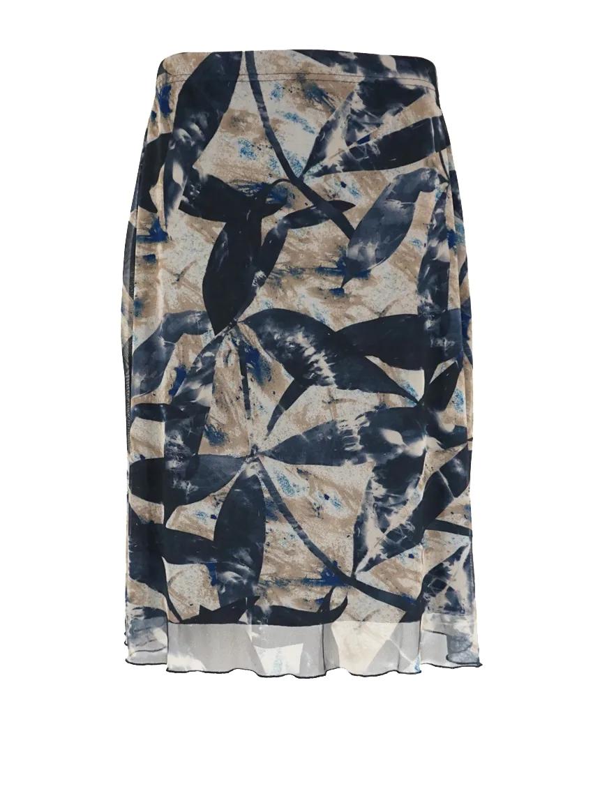 Leona per Donna dames rok in navy blauw en beige met abstracte bladprint in dubbellaags mesh