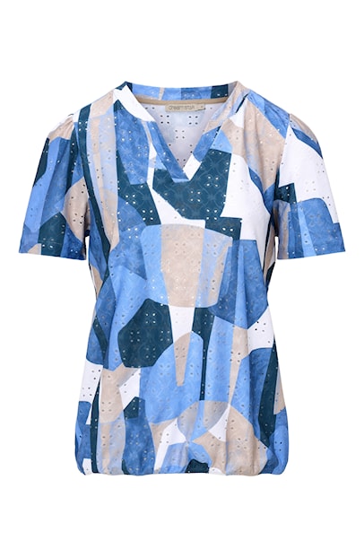 Geef uw garderobe een frisse impuls met deze prachtige indigo blauwe variant van de Dreamstar Becca blouson. Dit shirt combineert een moderne abstracte print met de klassieke elegantie van broderie (gaatjesstof). De verschillende blauwtinten en beige accenten maken het een veelzijdig kledingstuk dat perfect past bij uw favoriete jeans of een nette witte broek.