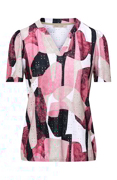 Breng textuur en kleur in uw outfit met de Dreamstar blouson Becca. Dit shirt valt direct op door de stijlvolle ‘broderie’ look; een verfijnd gaatjespatroon dat niet alleen prachtig oogt, maar ook zorgt voor een heerlijk luchtig draaggevoel. De abstracte print in roze, beige en zwarte tinten geeft het geheel een moderne en frisse uitstraling.