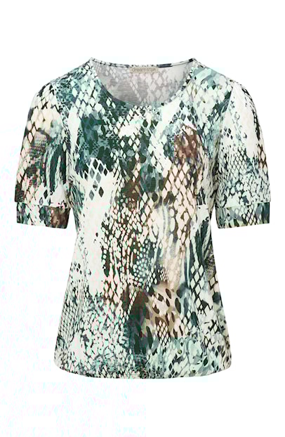 Breng een frisse, natuurlijke look in uw kledingkast met deze Dreamstar blouson Carino in een prachtige jade groene mix. Het verfijnde slangenpatroon combineert verschillende groentinten met wit, wat zorgt voor een levendig en modern effect. Dit shirt is de ideale keuze voor dames die houden van een trendy print in een kleur die uw gezicht direct laat stralen.