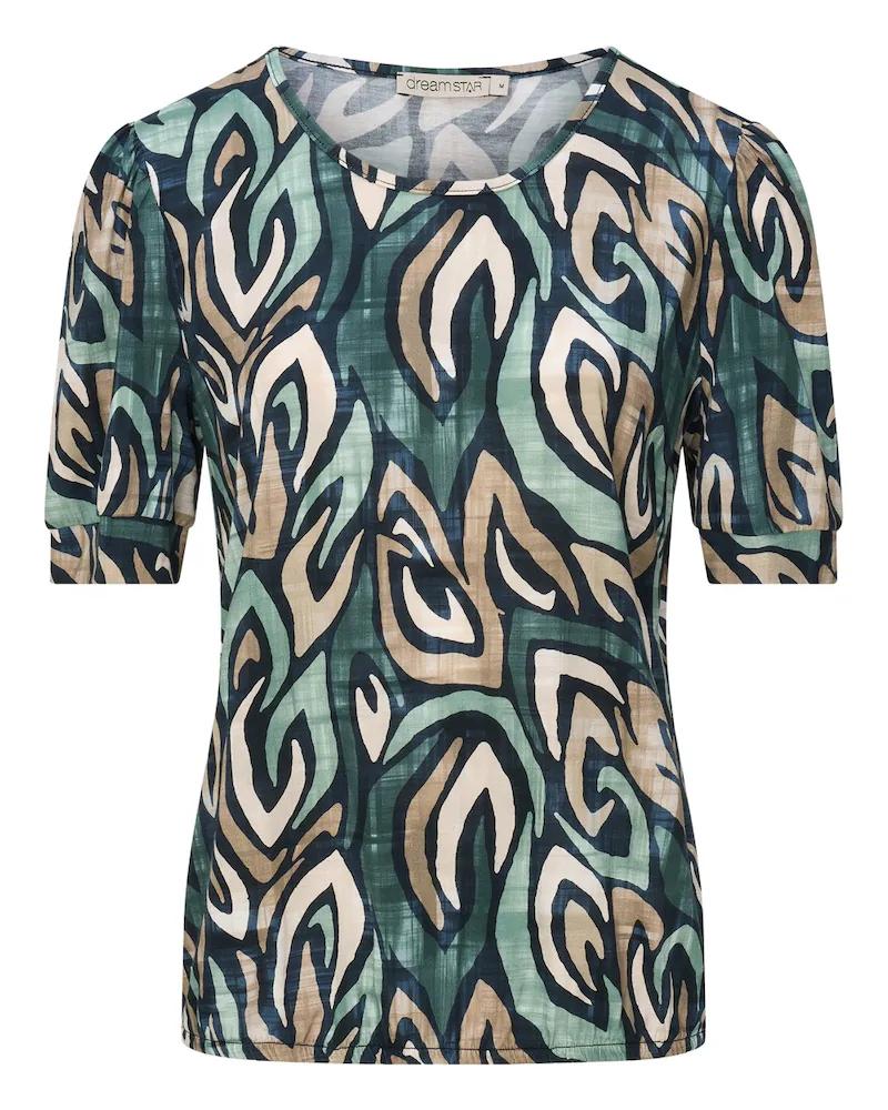 Dreamstar dames shirt model Snoes in jade mix met grafische print, korte pofmouwen en elastische boord.