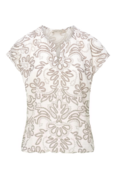 • Uniek design: Het grafische, bruine borduursel op de ivoorkleurige ondergrond geeft de top een exclusieve en chique look.