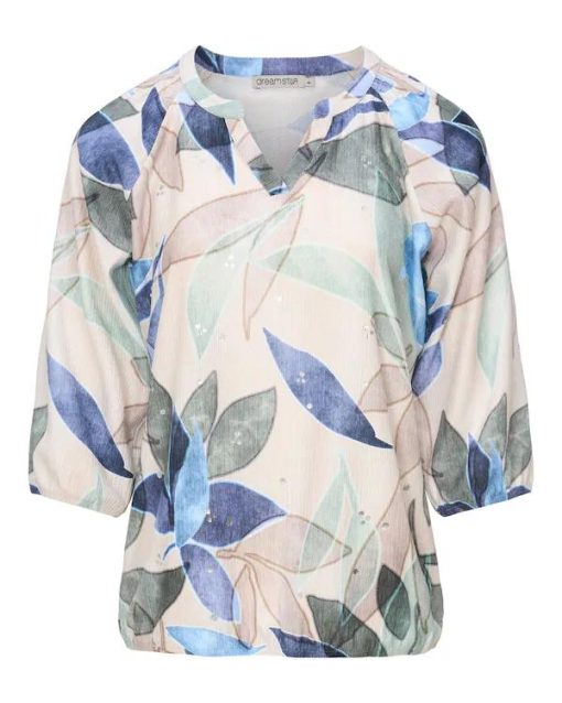 Geef uw outfit een frisse, natuurlijke uitstraling met de Dreamstar Solis top. Deze prachtige blouson valt direct op door het artistieke bladmotief in rustgevende blauw- en groentinten. Dankzij de subtiele details en de comfortabele snit is dit een item dat u keer op keer uit de kast zult pakken voor zowel een verzorgde daglook als een gezellig diner.