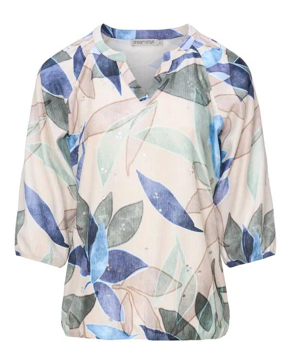 Dreamstar top Solis met blauw en groen bladendessin, V-hals en driekwart mouwen