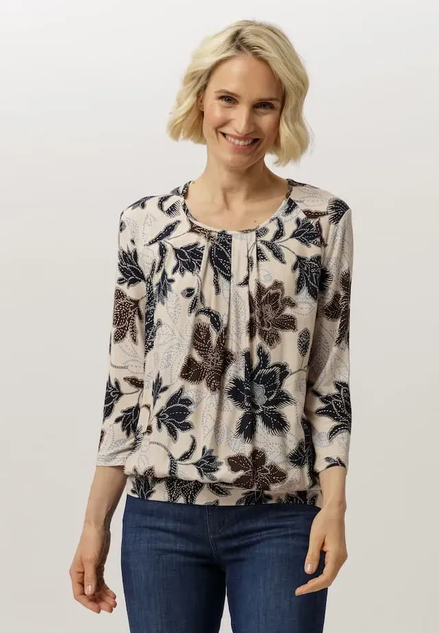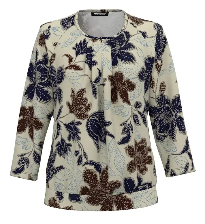 De Frank Walder blouson met bruine bloemenprint is een elegante en flatterende top die bekendstaat als een van de bestsellers van Frank Walder. De blouse heeft een dubbellaagse afwerking die zorgt voor een luxe uitstraling en extra draagcomfort. De ronde hals met subtiele plooien valt mooi om de halslijn en geeft een vrouwelijke touch. De driekwartmouwen maken dit model geschikt voor elk seizoen. Het zachte materiaal bestaat uit 93% viscose en 7% elastaan, wat zorgt voor een perfecte pasvorm en veel bewegingsvrijheid. Deze blouson is ideaal te combineren met zowel een nette pantalon als een casual jeans, waardoor het een veelzijdig item is in iedere garderobe.