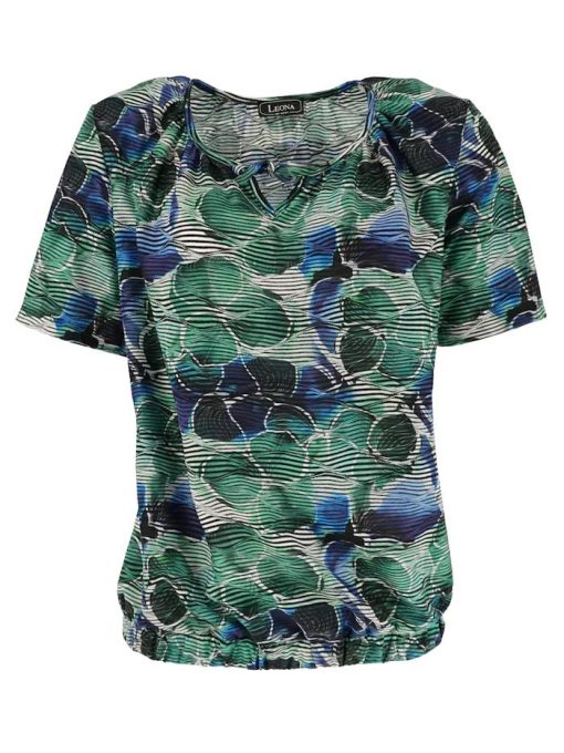 Leona per Donna Shirt – Blauw Groen – Botanische Print – Elastische Zoom