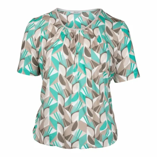 Voeg een vleugje elegantie toe aan uw garderobe met dit prachtige Sensia dames shirt in een stijlvolle mint- en zandkleurige print. Het shirt is gemaakt van 95% viscose en 5% elastaan, waardoor het zacht en comfortabel aanvoelt, terwijl het ook mooi aansluit op uw lichaam.