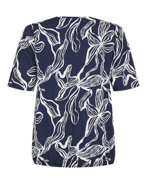 Kies voor een tijdloze en elegante uitstraling met deze marineblauwe Sunday blouson. Het shirt is voorzien van een prachtig wit bladmotief in een getekende stijl, wat zorgt voor een fris contrast. Dankzij het blouson-model met een elastische band aan de onderzijde valt het shirt licht bloezend over de heupen, wat erg flatterend werkt en een buikje subtiel verdoezelt.
