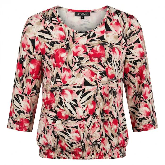 Breng kleur in uw dag met deze charmante gebloemde blouson van Sunday. De verfijnde print in roze- en beigetinten geeft dit kledingstuk een romantische en vrouwelijke uitstraling. Dankzij de soepelvallende viscosemix draagt de top heerlijk licht en luchtig, terwijl de elastische boord aan de onderzijde zorgt voor een flatterend, licht bloezend effect op de heup.