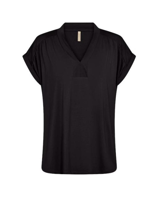 Zoekt u een zwart shirt dat net even luxer is dan een standaard T-shirt? Het Marica shirt van SoyaConcept is gemaakt van een hoogwaardige Lyocell-mix die niet alleen duurzaam is, maar ook een prachtige zijdeglans heeft. De v-hals en de subtiele plooitjes bij de schouders zorgen voor een vrouwelijke pasvorm die zowel solo als onder een jasje perfect tot zijn recht komt.