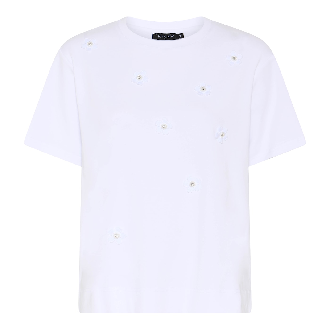 Voeg een romantische touch toe aan je basiscollectie met dit prachtige witte shirt van Micha. Dit item is de perfecte combinatie van een tijdloze klassieker en uniek design. De blikvangers zijn de subtiele witte 3D-bloemen die op het voorpand zijn aangebracht, elk verfijnd afgewerkt met een fonkelend strass-steentje in het hart.