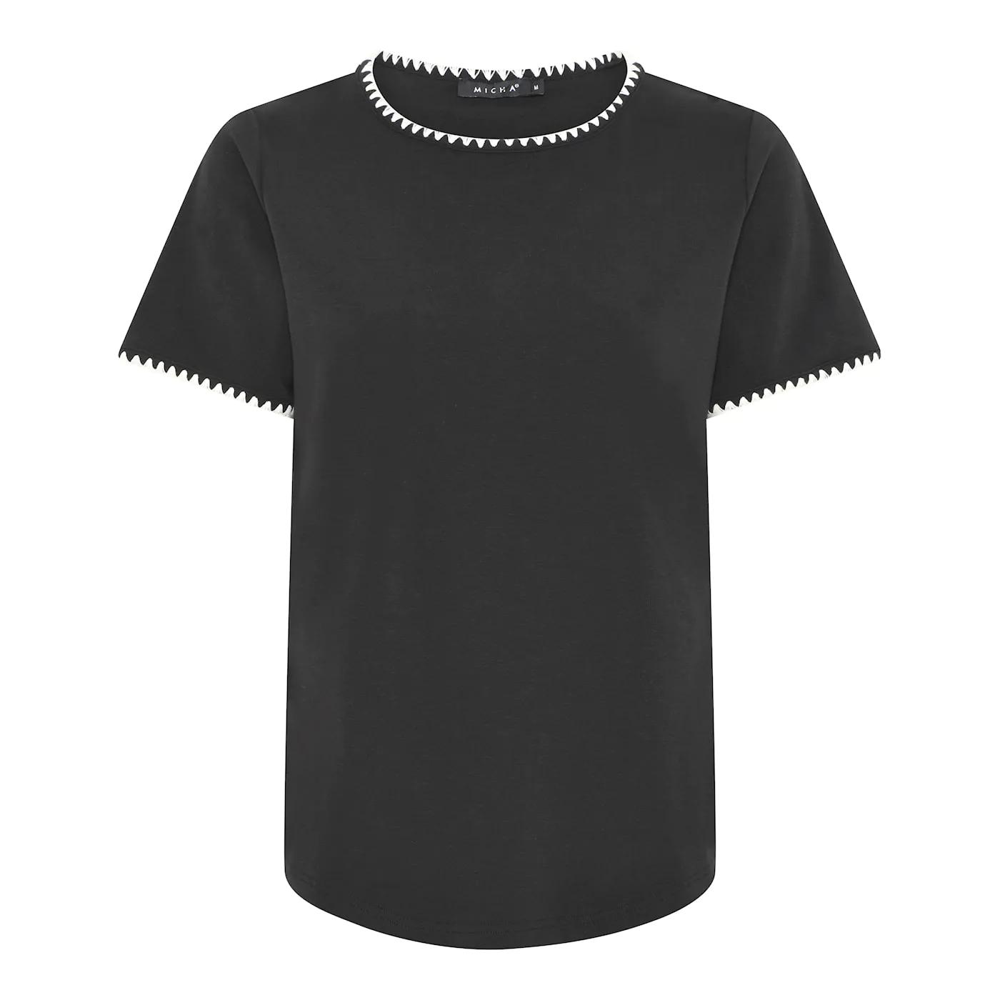Upgrade je basisgarderobe met dit stijlvolle zwarte shirt van Micha. Dit item is allesbehalve saai dankzij de opvallende, witte zigzag-afwerking langs de halslijn en de mouwen. Deze contrasterende details geven het shirt een moderne en grafische look die direct de aandacht trekt.