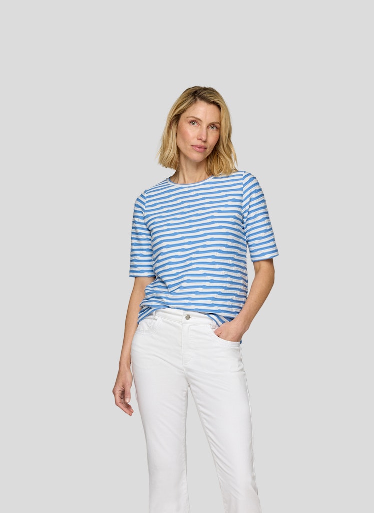 Lichtblauw wit gestreept dames T-shirt van Rabe met ronde hals en voelbare reliëf-structuur.