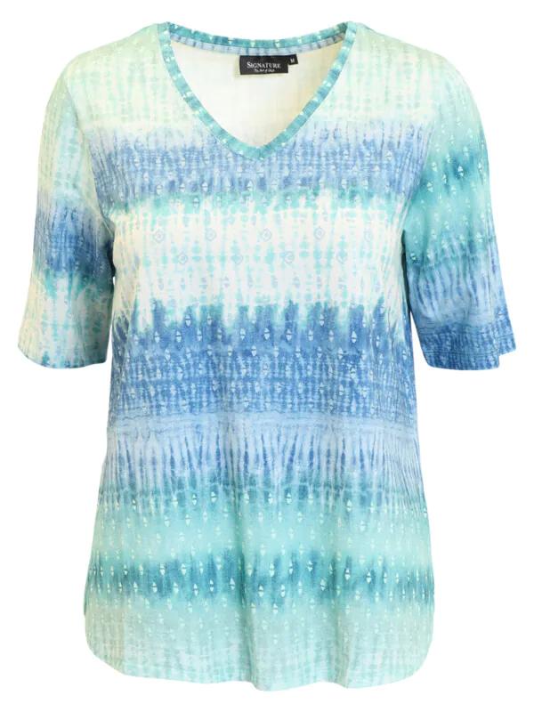 Vernieuw uw basisgarderobe met dit stijlvolle en uiterst comfortabele shirt van Signature. Dit model valt direct op door de prachtige horizontale kleurverloop in frisse mint- en blauwtinten, gecombineerd met een verfijnd etnisch patroon. Dankzij de hoogwaardige viscose-mix voelt het shirt zijdezacht aan op de huid en biedt het een elegante, soepele valling. Een ideaal shirt voor de vrouw die houdt van kleur en kwaliteit.